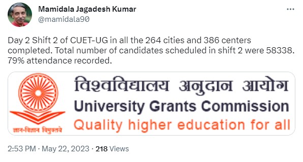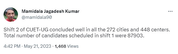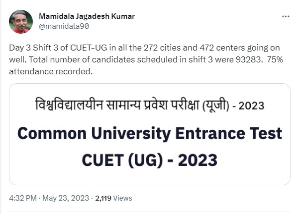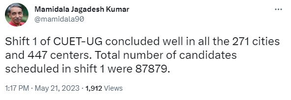 UGC Chairman M Jagadesh Kumar has stated that the CUET 2023 Shift 1 ended well in all 271 cities and 447 centres it as conducted in. The total number of candidates scheduled in shift 1 was 87,879.