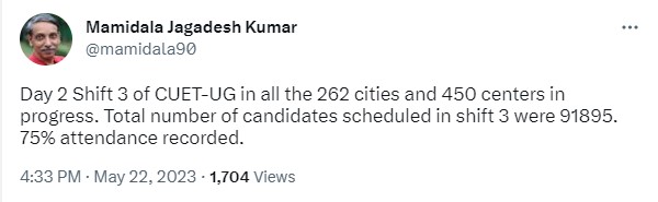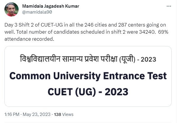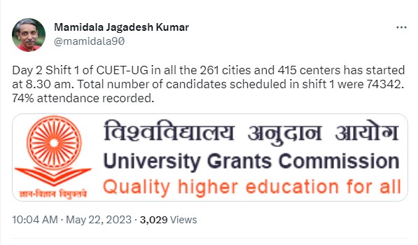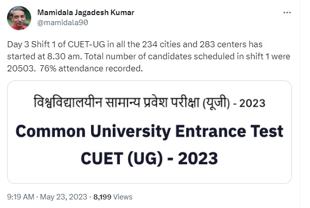 According to UGC Chairman M Jagadesh Kumar, CUET 2023 Day 3 Slot 1 was conducted in 234 cities and 283 centres. The total number of candidates scheduled in shift 1 was 20,503 recording an attendance of 76 per cent.
