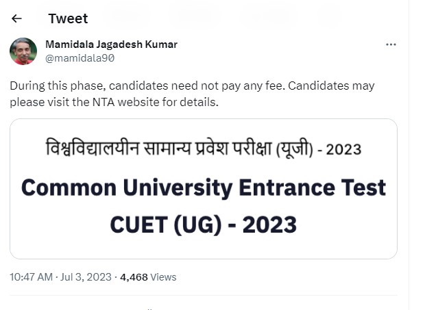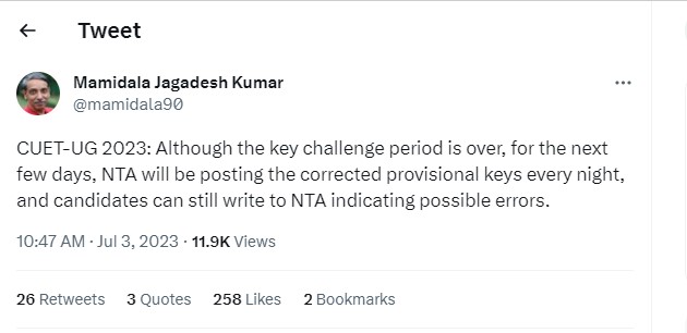 As NTA will be releasing the corrected CUET UG provisional answer key for next few days, no fee will be charged for the same. The UGC Chairman tweeted, ''During this phase, candidates need not pay any fee. Candidates may please visit the NTA website for details.'' Check out his tweet below:
