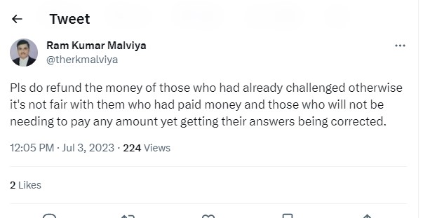 After the latest announcemwnt of UGC Chairman MJ Kumar, candidates posted a several tweets demanding refund of their fee for Provisional Answer Keys. Check out a student tweet below: