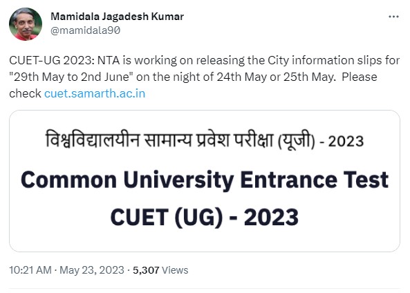 UGC Chairman has announced that the CUET admit card 2023 will be released on May 23 morning for exams dated May 25 to May 28.
