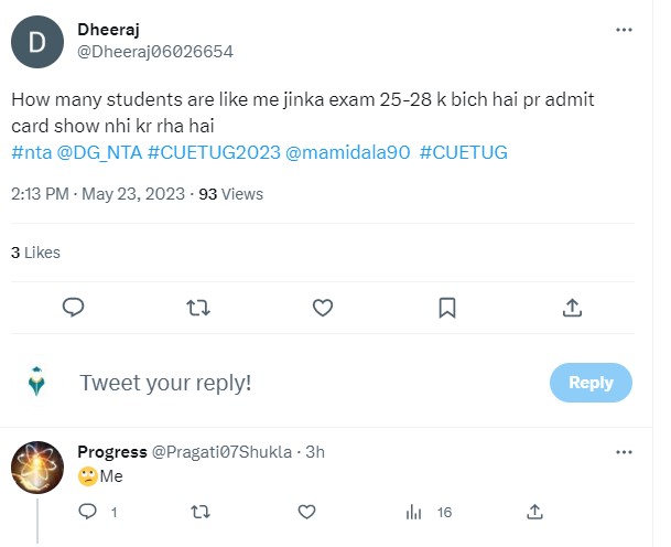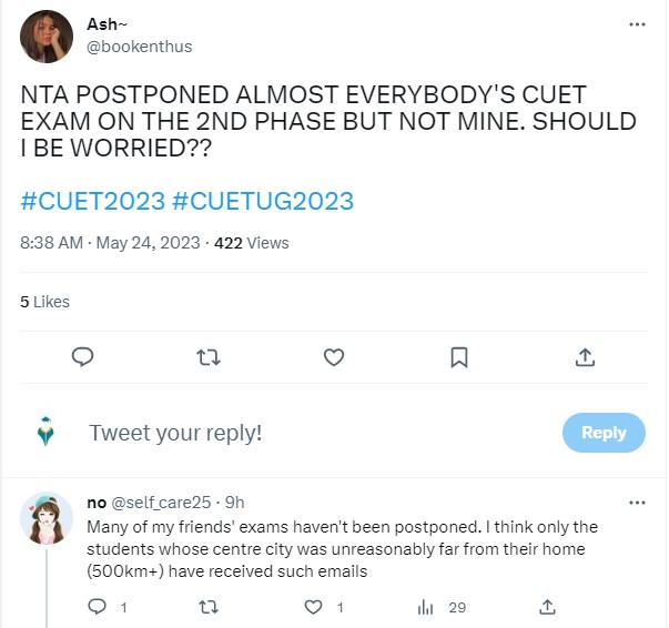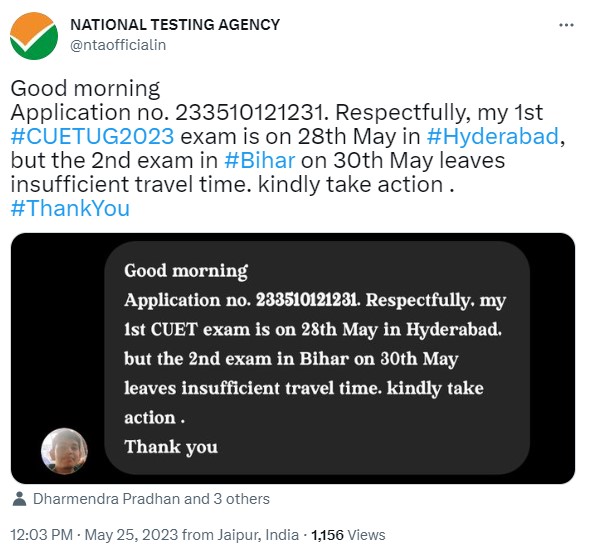 A candidate has complained that his exam centre for CUET 2023 exam dated May 28 is in Hyderabad, whereas the centre assigned for his May 30 test is in Bihar. He has raised concern over insufficient time to make necessary arrangements to travel between two cities located in the South and East of India.