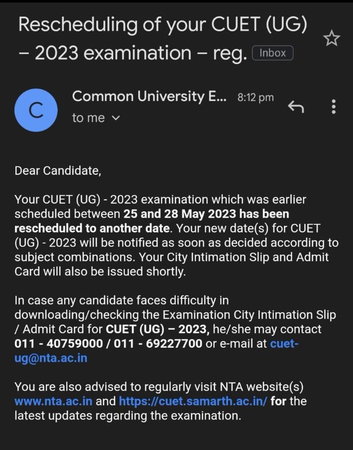 According to NTA, in case of any discrepancy in the particulars of the candidate or his/her photograph and signature shown on the CUET 2023 Admit Card and Confirmation Page, the candidate should immediately approach the NTA Help Line between 10.00 A.M. and 5.00 P.M. In such a case, the candidate would appear in the CUET 2023 exam centre with the already downloaded Admit Card. However, NTA will take necessary action to make corrections in the record later.