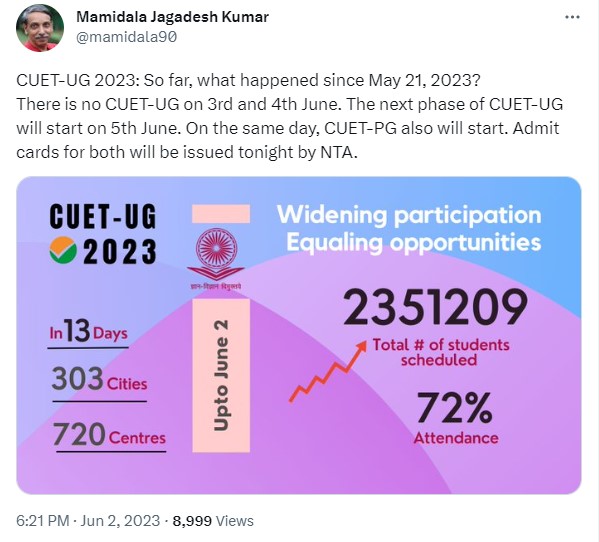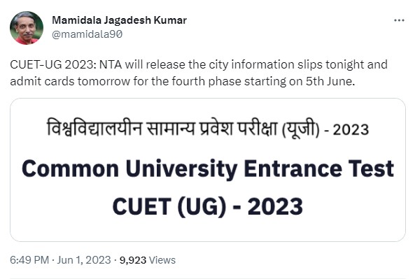 CUET admit card 2023 for Phase 4 is expected to be released today. UGC Chairman M Jagadesh Kumar tweeted on June 1 evening that the admit card for CUET 2023 starting on June 5 will be released on June 2.