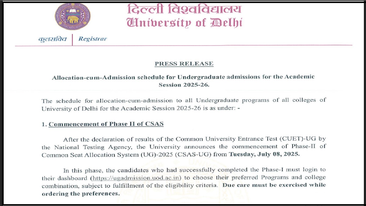 The University of Delhi has officially released the DU CSAS UG Phase 2 schedule on the official website, admission.uod.ac.in. The university will begin Phase 2 on July 8, 2025. During Phase 2 of the Common Seat Allocation System (CSAS), candidates are required to fill in their course and college preferences. Candidates who appeared for the Common University Entrance Test (UG) 2025 and have submitted their DU CSAS UG Form 2025, will be able to participate in the DU CSAS UG Registration Phase 2.