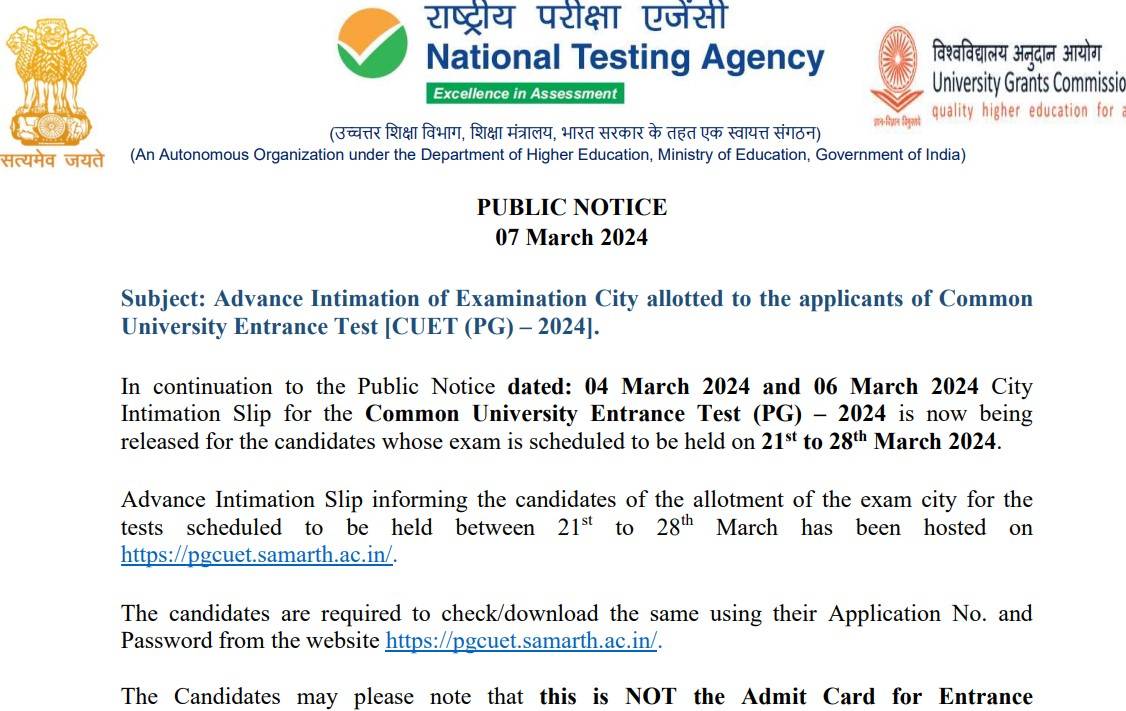 NTA released the CUET PG 2024 city slip phase 3 today, March 7, 2024, on its official website, pgcuet.samarth.ac.in. Successfully registered candidates can download the CUET PG city intimation slip by logging in with their registration ID and password. CUET PG hall ticket 2024 will be released on March 7, 2024. Read this Shiksha article to know how to get CUET PG city slip 2024 release and download link.