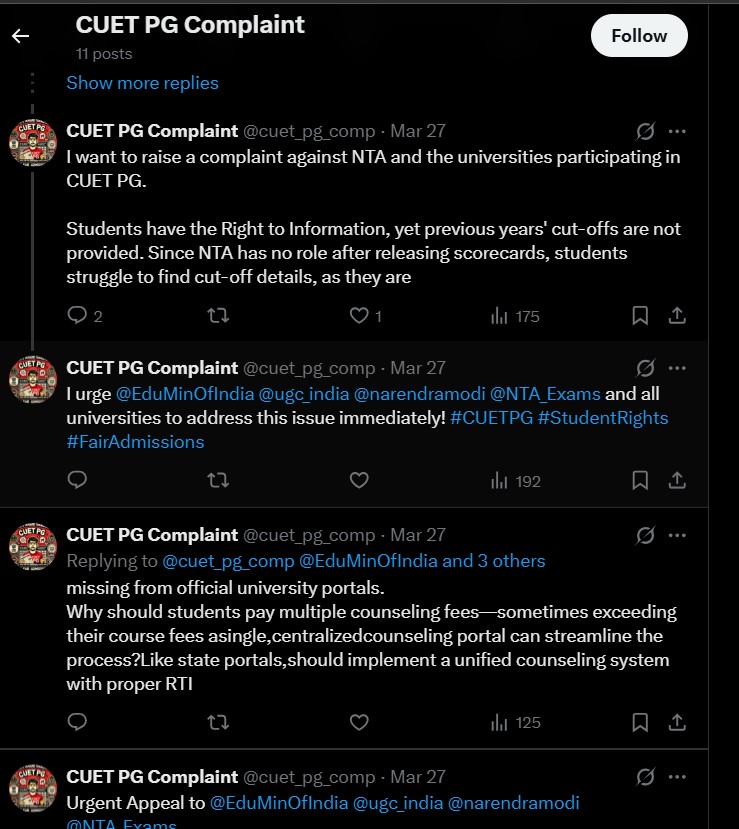 Candidates on X (Twitter) demand for One Unified CUET PG 2025 Counselling Portal!