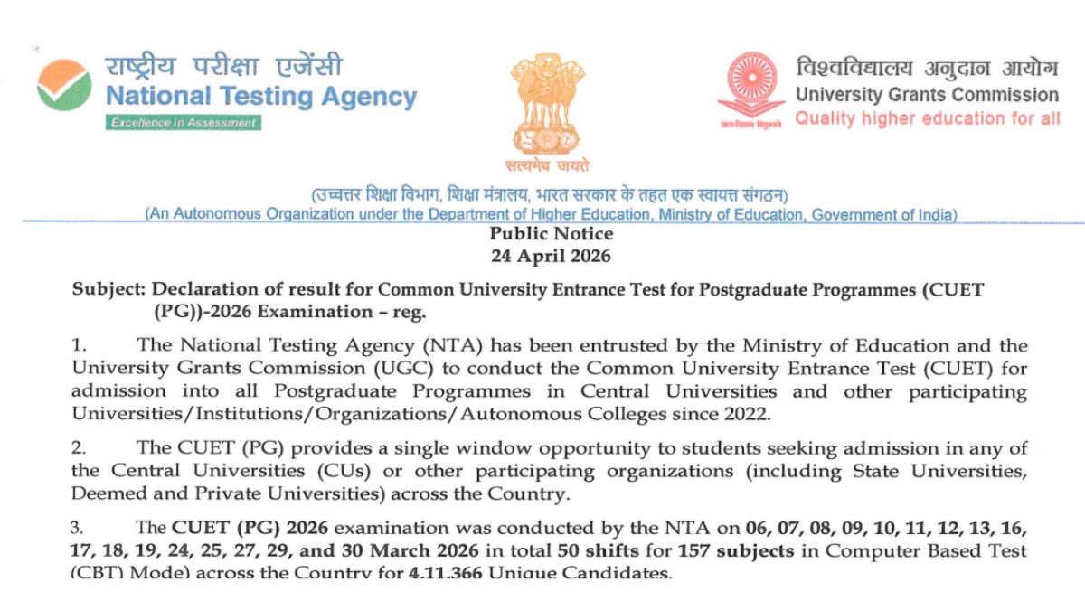 National Testing Agency has released the CUET PG 2026 final answer key today, April 24, 2026. Candidates who appeared for the Common University Entrance Test for Postgraduate (CUET PG) can now download CUET PG final answer key PDF at exams.nta.nic.in/CUET-PG/ for their subject. The CUET PG final answer key 2026 has been released along with the results. The board has released the result statistics for this year as well. Earlier, NTA released the provisional answer key and opened the challenge window for all students. After reviewing all objections, NTA has now published the CUET PG 2026 final answer key PDF.