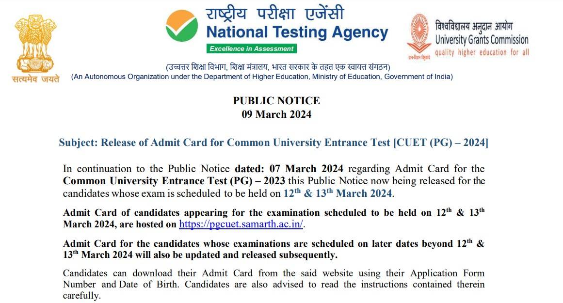 CUET PG admit card 2024 for March 11 and March 12 examination released by NTA on March 9, 2024. Candidates whose CUET PG 2024 city slips were earlier released can visit the official website for CUET PG 2024 hall ticket download ie., pgcuet.samarth.ac.in.Β Read this Shiksha article to learn how to download the CUET PG admit card 2024.