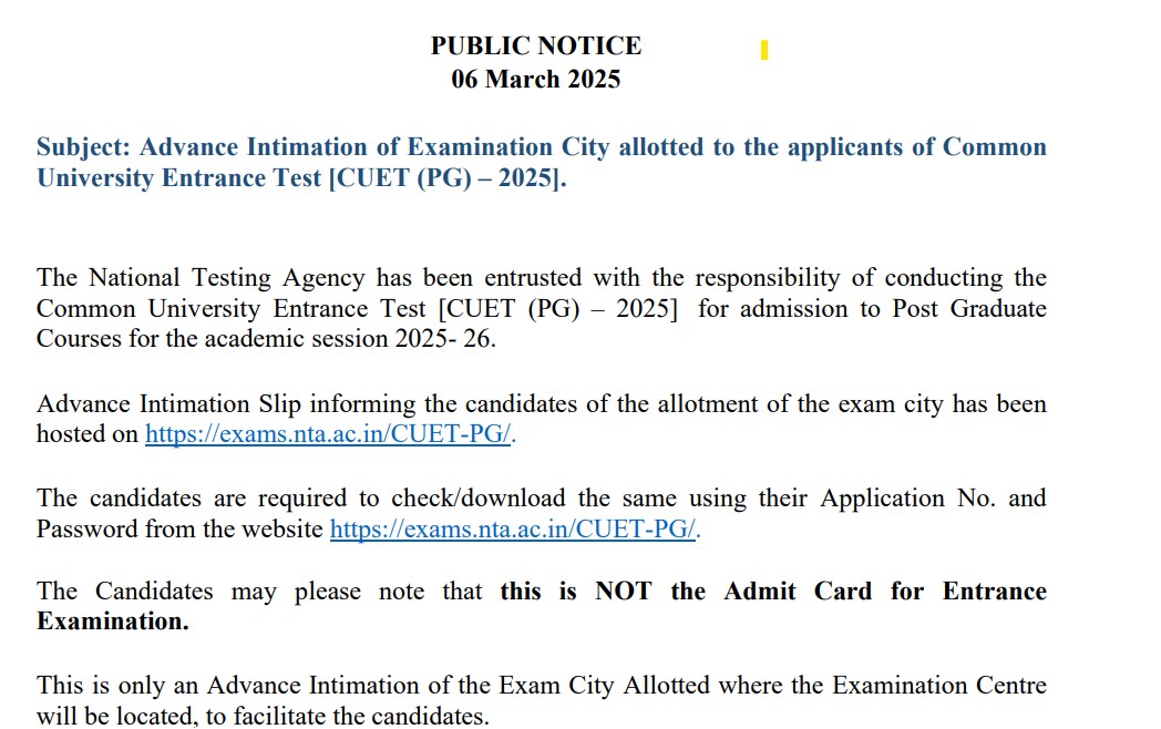 NTA has released the CUET PG 2025 Advance City Intimation Slip today, March 6, 2025. Sucessfully registered candidates can now visit the official webiste ie., exams.nta.ac.in/CUET-PG and logging in thier registered account with the help of log in credentials i.e, username and password to know about their CUET PG exam centre city. NTA will release the CUET PG 2025 admit card soon. The hall ticket will act as an important document as a hall ticket to the centre and carries candidates' personal and exam paper details.