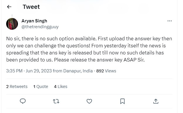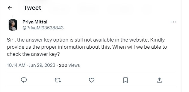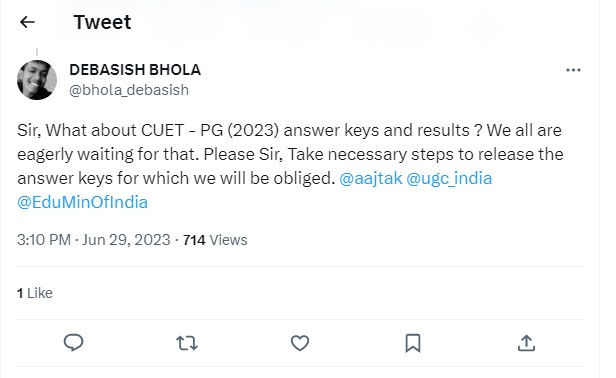 As the answer key of CUET UG 2023 has been released, candidates are now demanding the CUET PG answer key. A candidates took to the social media expressed the same. Check out the Twitter reaction of student below: