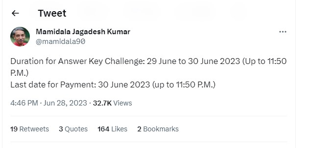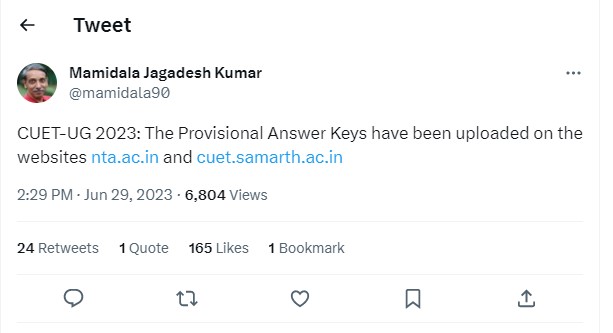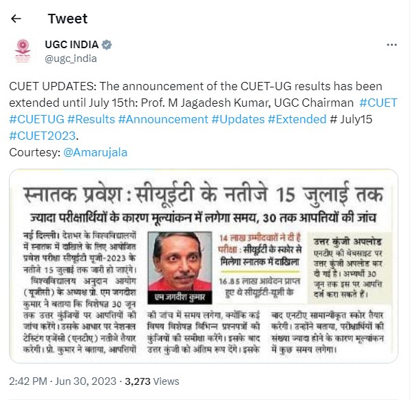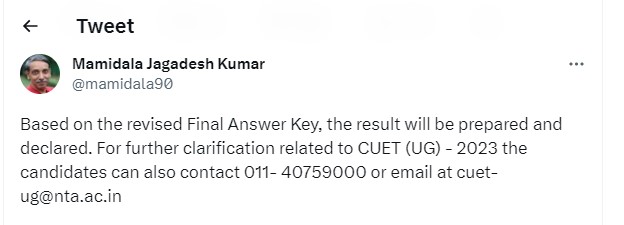 NTA has uploaded the CUET UG 2023 Answer Key at the official website of the exam. Check out UGC Chairman latest tweet regarding same below: