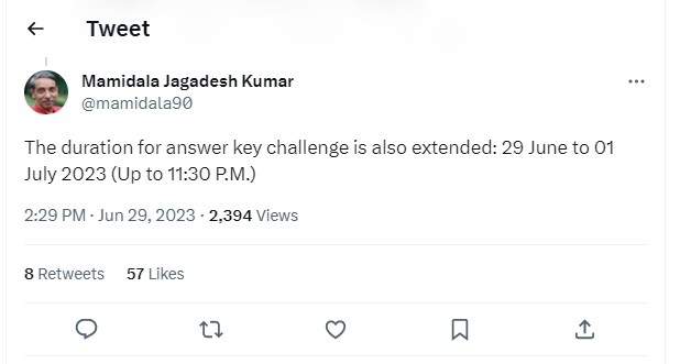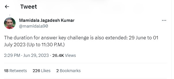 CUET UG 2023 Answer Key was released on June 28. The date to challenge the CUET Answer Key was June 29 to June 30. As per the latest updates, UGC Chairman has announced that CUET Answer Key challenge date has been extended from June 30 to July 1. Taking to Twitter handle he, wrote, ''The duration for answer key challenge is also extended: 29 June to 01 July 2023 (Up to 11:30 P.M.).''
