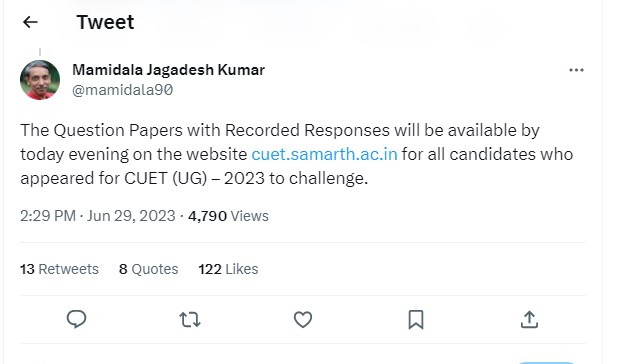 UGC Chairman informing the same tweeted, ''The Question Papers with Recorded Responses will be available by today evening on the website https://cuet.samarth.ac.in for all candidates who appeared for CUET (UG) – 2023 to challenge.''