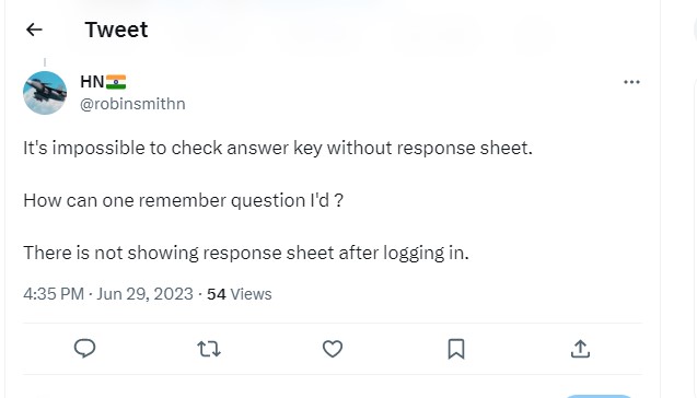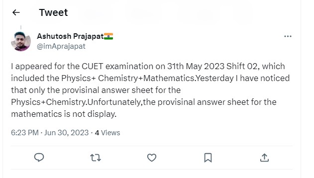 Asking details about CUET UG Question paper and Response Sheet, a candidate mentioned the UGC Chairman MJ Kumar on Twitter handle and asked aboiut the time of the response sheet release. Check out a candidate tweet below: