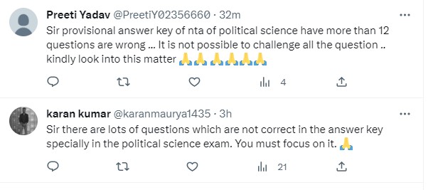 After the answer key release, a number of students complaint about CUET UG Politicial Science Answers. Students stated that many question in Political Science paper are wrong. Check out some of their tweets below: