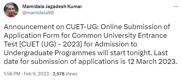 CUET UG 2023 registration process will start tonight, February 9. The last date to submit the application form is March 12. UGC Chairman M Jagadesh Kumar has tweeted, “Announcement on CUET-UG: Online Submission of Application Form for Common University Entrance Test [CUET (UG) - 2023] for Admission to Undergraduate Programmes will start tonight. The last date for submission of applications is 12 March 2023.”