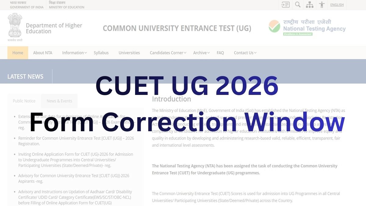 The National Testing Agency (NTA) will open CUET UG 2026 correction window today at, cuet.nta.nic.in. Candidates who have successfully registered and paid the CUET application fee will be able to edit their online application form until February 11, 2026. This correction facility allows candidates to correct errors in specific fields of the application form. However, applicants must carefully review the list of editable and non-editable details before making corrections.