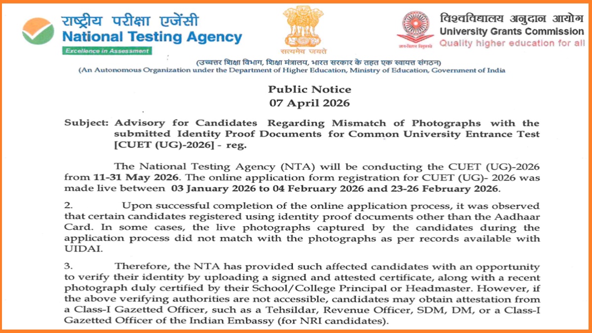 NTA has issued an important advisory for candidates regarding the mistmatch of photographs with the submitted identity proof documents for CUET UG 2026.ย