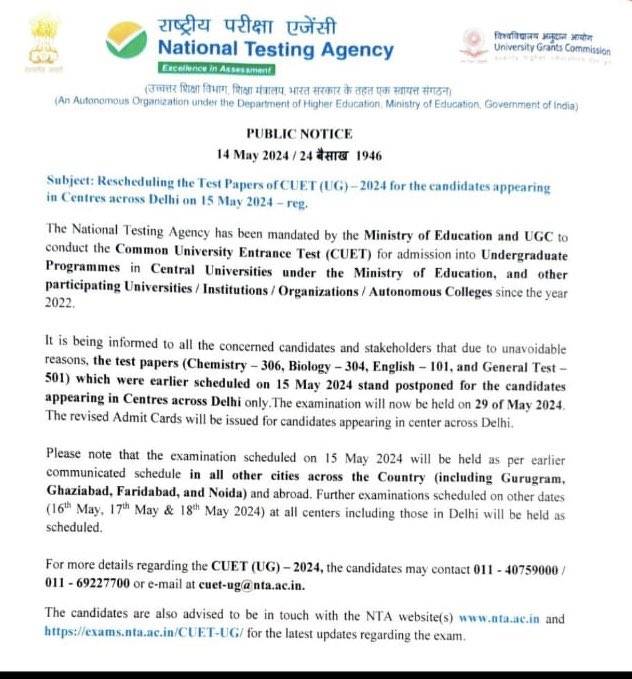 The NTA notice also clarifies that the CUET exams scheduled for May 15, 2024, will proceed as originally planned in all other cities across the country, including Gurugram, Ghaziabad, Faridabad, and Noida, as well as abroad. Additionally, exams on subsequent dates, May 16, 17, and 18, 2024, will continue as scheduled in all centers, including those in Delhi.