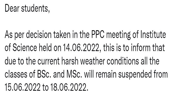 Dean Prof Madhoolika Agrawal at Faculty of Science BHU tweeted, "Dear students, As per decision taken in the PPC meeting of Institute of Science held on 14.06.2022, this is to inform that due to the current harsh weather conditions all the classes of BSc. and MSc. will remain suspended from 15.06.2022 to 18.06.2022."