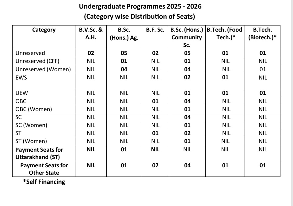 The counselling process will be for admissions to six UG programmes: B.V.Sc. & A.H., B.Sc. (Hons.) Agriculture, B.F.Sc., B.Sc. (Hons.) Community Science, B.Tech. Food Technology, and B.Tech. Biotechnology.