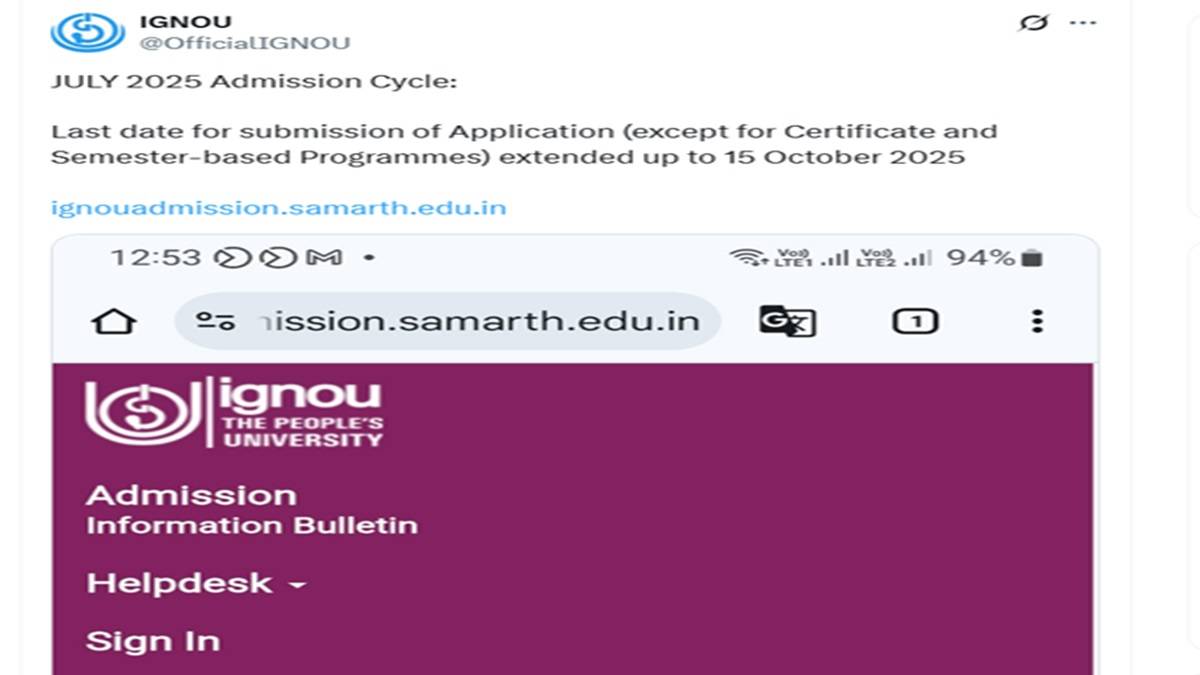 The Indira Gandhi National Open University (IGNOU) has further extended last date for July 2025 session admission. The previous deadline was Sept 30, 2025, which has been extended to Oct 15, 2025, for most of Open Distance Learning (ODL) and online courses.