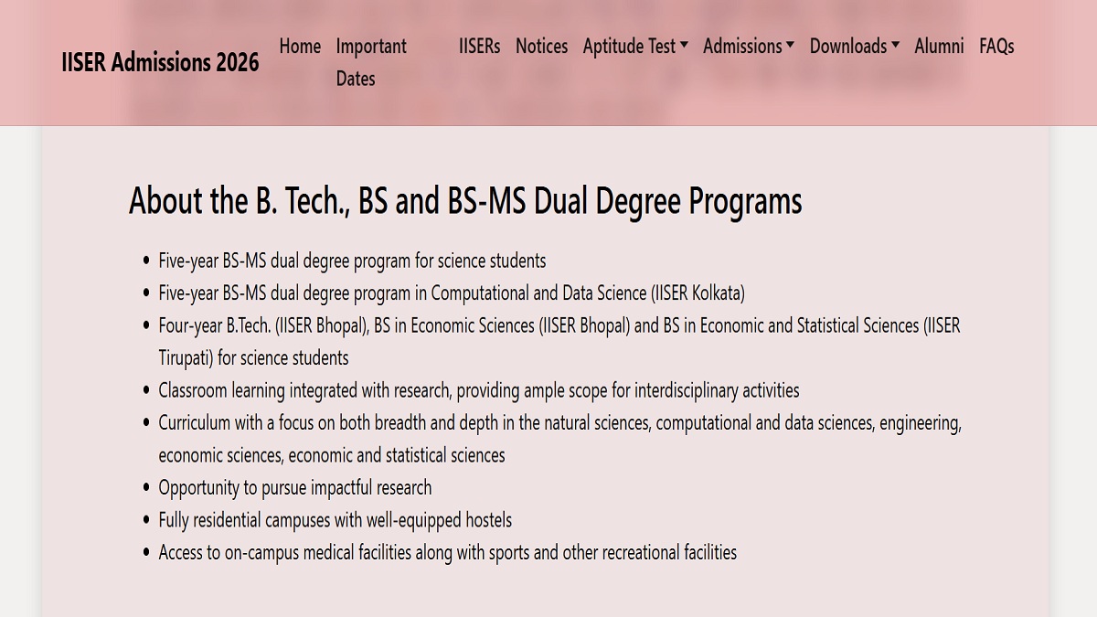 IISER Admission: Indian Institutes of Science Education and Research has released admission schedule for IISER Aptitude Test 2026. As per announced dates, IAT registration will commence from March 5. Candidates can complete their IAT exam registration form till April 13, 2026. They can fill out IISER admission application form 2026 online at official website iiseradmission.in.