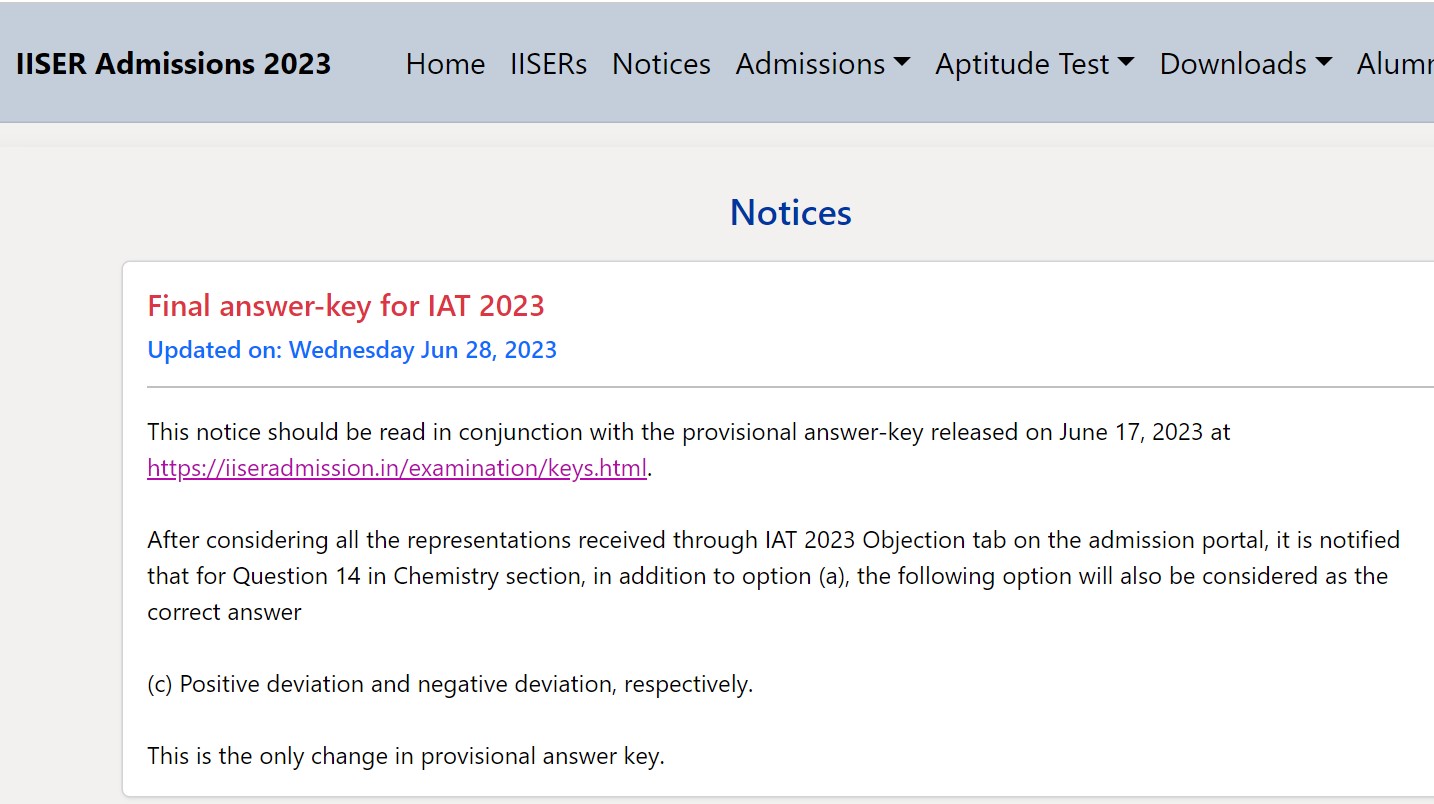 Candidates can view the IISER official notice snippet on the IAT 2023 Final answer key below:
