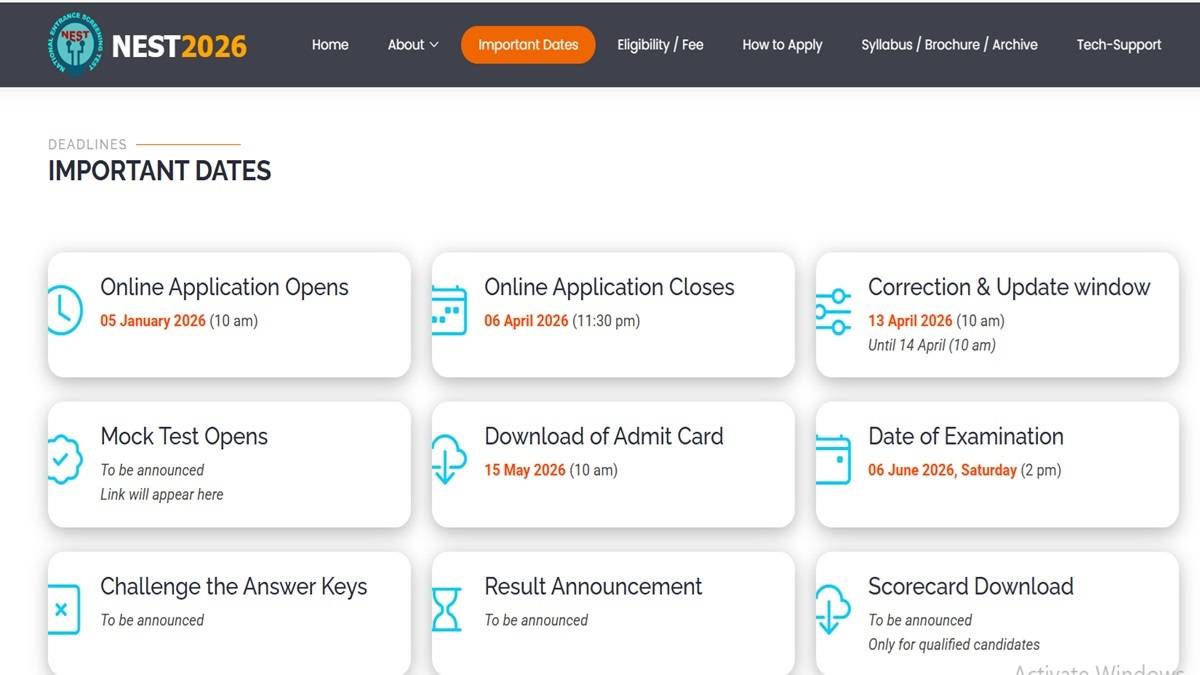 NEST 2026 Exam Registration: National Entrance Screening Test 2026 schedule has been officially released, giving aspirants clarity on registration timeline and exam date. As per notification available on official NEST website online application process will begin on January 5, 2026, at 10 AM.