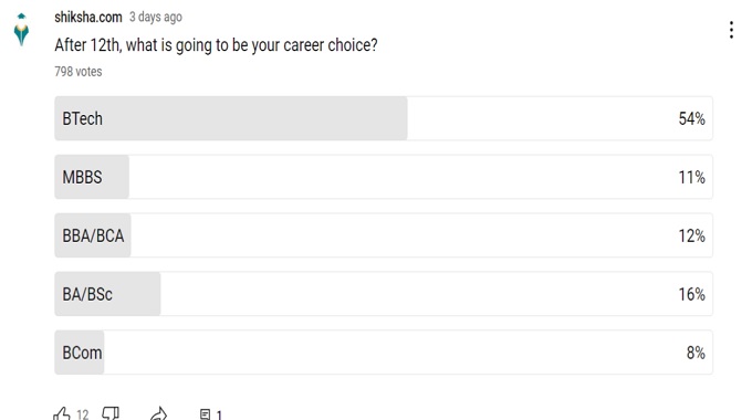 For the candidates who are confused about which path to take after passing class 12, here is some useful information. Shiksha conducted a Youtube poll on the popular career choices after class 12. As many as 800 students participated in the poll.