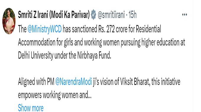 She wrote on X, "The @MinistryWCD has sanctioned Rs. 272 crore for Residential Accommodation for girls and working women pursuing higher education at Delhi University under the Nirbhaya Fund. Aligned with PM @NarendraModi ji's vision of Viksit Bharat, this initiative empowers working women and girls pursuing higher education. This project will provide 1000 beds with enhanced security, CCTV surveillance and gender-sensitive amenities."