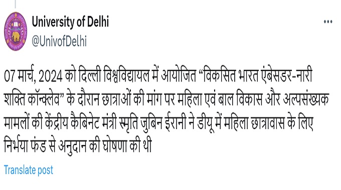 University of Delhi said on X, "On the demand of girl students, during the โVikas Bharat Ambassador-Nari Shakti Conclaveโ organized at Delhi University on March 07, 2024, Union Cabinet Minister of Women and Child Development and Minority Affairs, Smriti Zubin Irani gave grant from Nirbhaya Fund for women's hostel in DU. had announced."