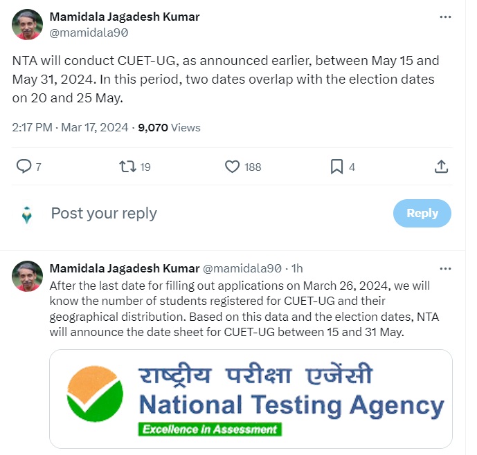 In response to concerns over the overlap between CUET UG 2024 exam dates and the Lok Sabha elections, University Grants Commission (UGC) Chairman, Prof Mamidala Jagadesh Kumar, has hinted at potential alterations to the exam schedule.