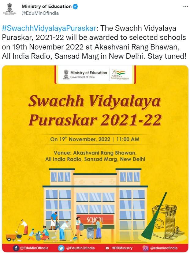 MoE Swachh Vidyalaya Puraskar 2021-22: The Ministry of Education is all set to host the Swachh Vidyalaya Puraskar for the 2021-22 session tomorrow, November 19, 2022. Selected schools will be awarded the Swachh Vidyalaya Puraskar at Akashvani Rang Bhawan, All India Radio, Sansad Marg in New Delhi. The award has been instituted to honor, recognise, inspire and celebrate excellence in sanitation and hygiene practices in schools.