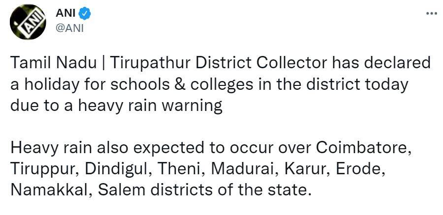 The schools and colleges have been declared holiday until further notice. As per an ANI tweet, "Tirupathur District Collector has declared a holiday for schools & colleges in the district today due to a heavy rain warning. Heavy rain is also expected to occur over Coimbatore, Tiruppur, Dindigul, Theni, Madurai, Karur, Erode, Namakkal, Salem districts of the state." the tweet read