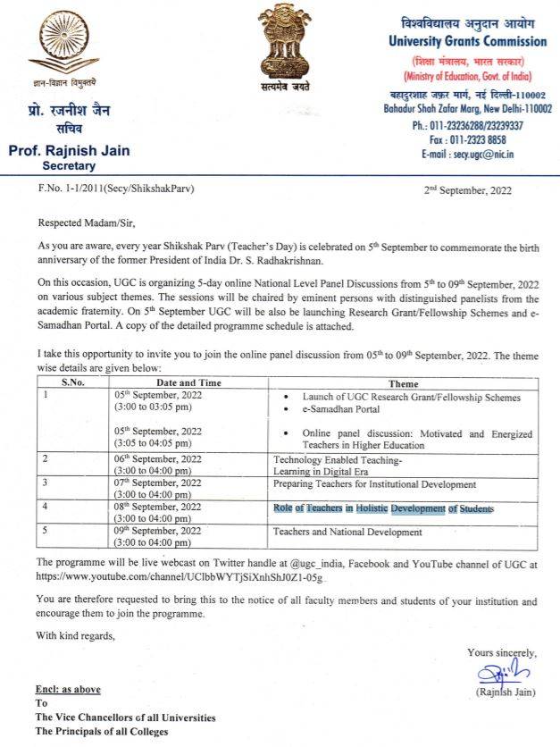“On this occasion, UGC is organizing 5-day online National Level Panel Discussions from 5th to 09th September 2022 on various subject themes. The sessions will be chaired by eminent persons with distinguished panelists from the academic fraternity. On 5th September UGC will be also be launching Research Grant/Fellowship Schemes and eSamadhan Portal. A copy of the detailed programme schedule is attached,” the notice said.