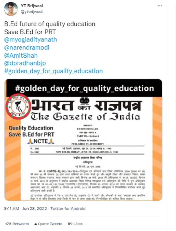 A Twitter user said, “ B.Ed future of quality education. Save B.Ed for PRT.”