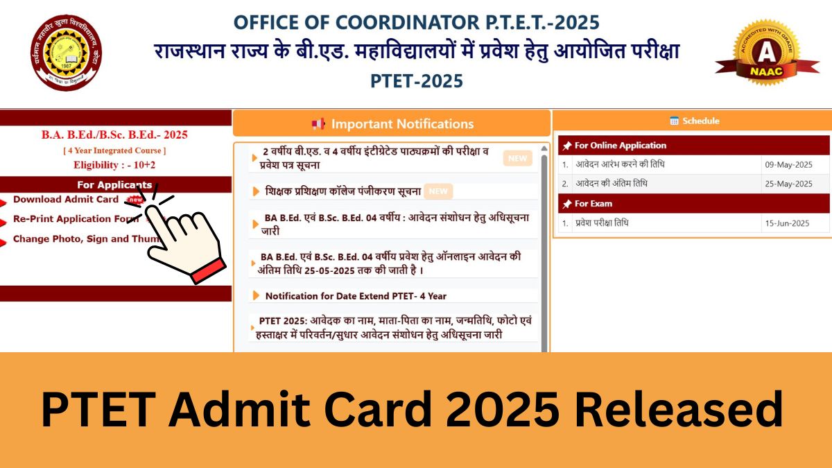 The PTET 2026 admit card will be issued on the official website of the exam conducting authority. Registered candidates will be required to visit the official website of the Rajasthan PTET to download the PTET 2026 admit card and save a copy of the Rajasthan PTET admit card for further reference.