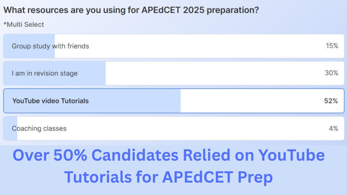 Shiksha surveyed students who appeared in the AP EdCET 2025 examination on June 5, 2025. The survey revealed that a lot of candidates, amounting to over 52 percent, to be specific, turned to YouTube tutorials as their primary source for preparation.