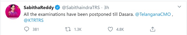 Telangana Government has announced that all the exams in the state have been postponed until the Dasara holidays. The Indian meteorological department has predicted heavy rainfall until October 22, 2020 in the state. The state education minister Sabitha Indra Reddy made the announcement through her Twitter handle. The move is expected to give relief to more than 5 lakh students across the state. After many students had asked the education minister to postpone their supplementary exams after which the education minister made this announcement.