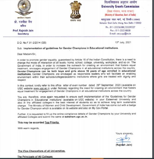 University Grants Commission (UGC) has directed the Vice-Chancellors and Principals of various educational institutions to implement the guidelines of gender champions in all Universities and colleges.