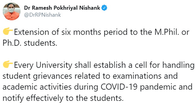 The University Grants Commission on April 29 announced an extension of six months to be granted to MPhil, PhD students. The Commission further added that Universities may conduct the MPhil and PhD Viva -Voce examinations through video conferencing using Skype, Google, Microsoft Technologies or any other reliable and mutually convenient technology. While talking about the intermediate semesters, the Commission suggested that practical examinations may be conducted during the ensuing semesters.