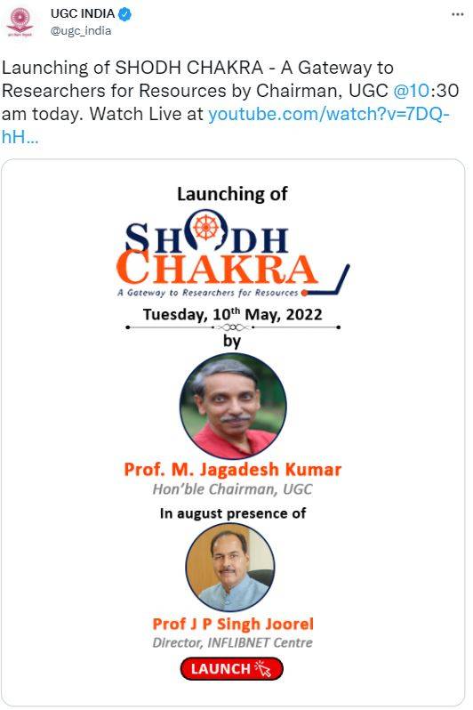 The University Grants Commission (UGC) along with the Information and Library Network (INFLIBNET) Centre has launched the "Shodh Chakra" to help research scholars and their guides or supervisors in their research. UGC chairman Mamidala Jagadesh Kumar launched the Shodh Chakra initiative via virtual mode, today, May 10, 2022, at 10:30 am. Under this initiative, research scholars will get the facility to collect, store, organise and cite their research work.