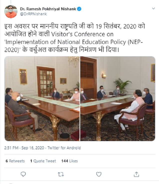 Union Education Minister Ramesh Pokhriyal Nishank has invited President Ram Nath Kovind for a virtual programme - Visitors Conference on the Implementation of National Education Policy (NEP 2020) to be held on September 19.
