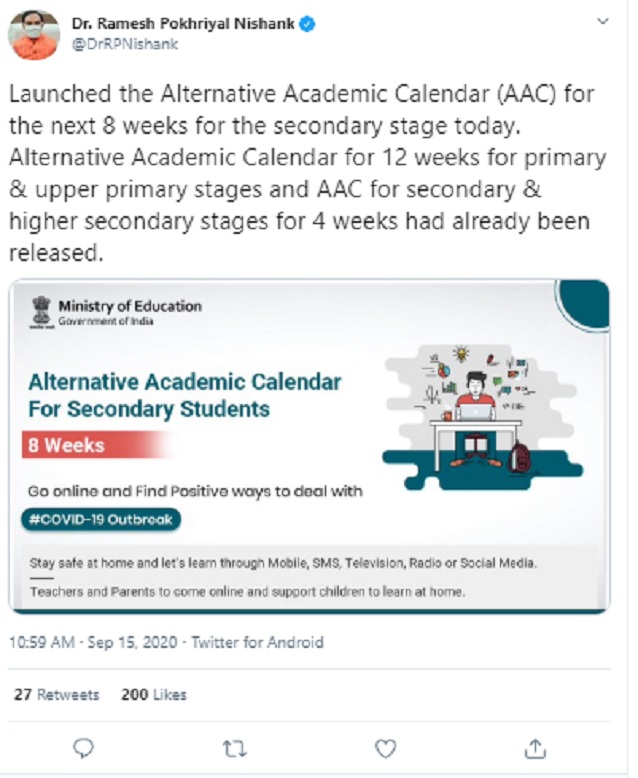 Education Minister Ramesh Pokhriyal ‘Nishank’ took to Twitter and said, “The Calendar further aims to empower our students, teachers, school principals & parents with positive ways to deal with COVID-19 via online teaching-learning resources and achieve the best possible learning outcomes.”