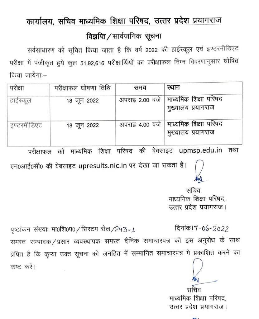 UP Board Result 2022 to be released today, June 18 at upresults.nic.in