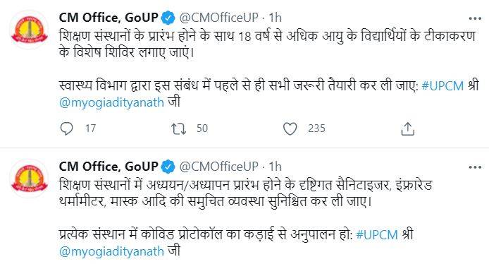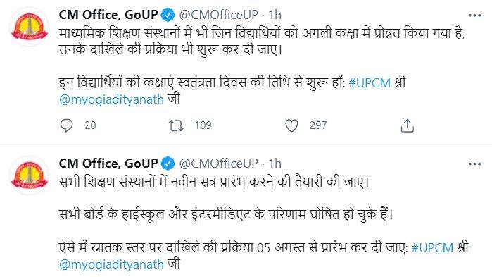 UP 10th Results 2021 and UP 12th Results 2021 have already been declared and more than 99 percent of students passed in both classes. Approximately 30 lakh students were supposed to appear for UP 10th exams and more than 26 lakh students were to appear for UP 12th board exams. UP Board Exams 2021 for Classes 10 and 12 were canceled amid the ongoing pandemic situation. With the release of UP Board results based on alternative assessment criteria, the government has asked state universities to begin the admission application process for undergarduate courses from August 5, 2021, onward. Meanwhile, it has been decided that the state colleges and universities will reopen from September 1 onwards. Check the official tweets posted by UP CMO below:
