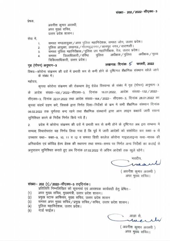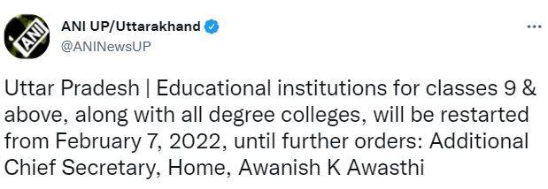 UP School Reopening: Schools, colleges in Uttar Pradesh are allowed to reopen from Monday, February 7. Offline classes will resume in the state for Classes 9 to 12. According to the order issued by Awanish Awasthi, additional chief secretary, home, all COVID-19 guidelines will be followed at the time of reopening of physical classes in educational institutions.