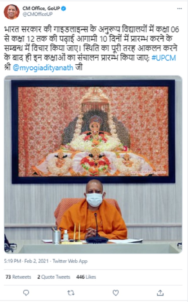 The official Twitter handle of CMO UP has tweeted, “According to the guidelines of the Government of India, the schools should be considered for starting classes from class 6 to class 12 in the next 10 days. These classes should be started only after a thorough assessment of the situation.”